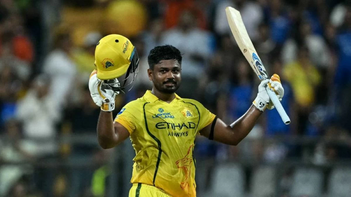 Chennai Super Kings' Indian cricket player Sanju Samson celebrates after scoring a century (100 runs) during the 2026 Indian Premier League (IPL) T20 match between Mumbai Indians and Chennai Super Kings at the Wankhede Stadium in Mumbai on April 23, 2026. (Reuters)