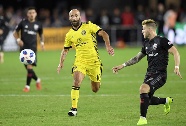 Federico Higuain scored two goals and converted in the penalty shootout as the Columbus Crew advanced in the MLS Cup playoffs on Thursday over Wayne Rooney's DC United.