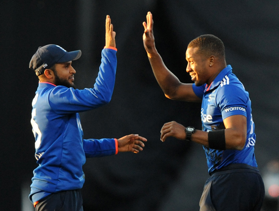 Adil Rashid and Chris Jordan after England beat New Zealand by 210 runs after the One Day International match between England and New Zealand at Edgbaston cricket ground in Birmingham, England. (AP)