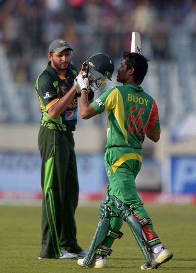 After Bangladesh had made their highest ODI total of 326-3 having elected to bat first, Pakistan sneaked home with a ball to spare thanks to another spectacular knock from Afridi who smashed seven sixes and two boundaries before being run out in the 48th over.