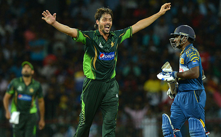 In this photograph taken on July 30, 2015, Pakistan cricketer Anwar Ali celebrates after dismissing Sri Lankan batsman Kusal Perera (R) during the first Twenty20 International cricket match between Sri Lanka and Pakistan at The R Premadasa International Cricket Stadium in Colombo. Pakistan all-rounder Anwar Ali, who once ironed socks for a living as a teenage factory labourer, may have finally found his feet in international cricket after years of unfulfilled promise. (AFP)