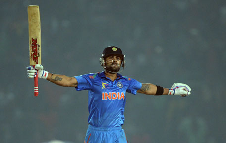 Indian captain Virat Kohli reacts after scoring a century during the second match of the Asia Cup one-day cricket tournament against Bangladesh at the Khan Shaheb Osman Ali Stadium in Fatullah, Dhaka on February 26, 2014. (AFP)