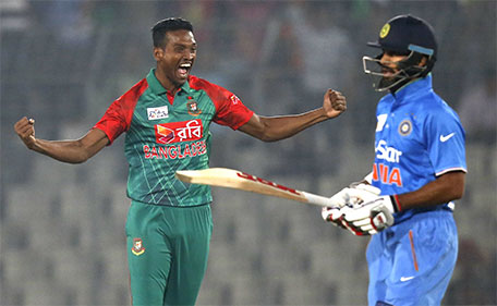 Al Amin Hossain bowled opener Shikhar Dhawan for two before skipper Mortaza got rid of in-form Virat Kohli, who offered an easy catch to Mahmudullah at mid off for eight, to provide the initial jolt.