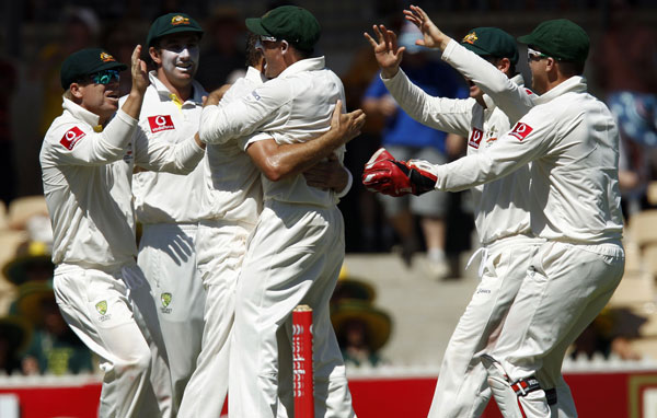 Michael Hussey (3rd R) of Australia celebrates catching Rahul Dravid of India with David Warner (L), Shaun Marsh (2ndL), Ryan Harris (3rdL) and Brad Haddin (R) during the fourth day of the fourth test cricket match against India in Adelaide, January 27, 2012. (REUTERS)
