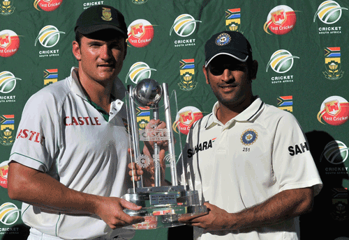South African captain Graeme Smith and Indian captain Mahendra Singh Dhoni pose for photos after the fifth day of the third and final Test between India and South Africa at the Newlands Stadium in Cape Town on January 6, 2011. India validated their ranking as the number one team in Test cricket when they drew the third and final Test and earned a share of the series against second-ranked South Africa at Newlands. (AFP)