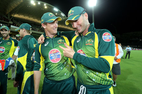 George Bailey celebrates with Michael Clarke of Australia after game five of the One Day International Series between Australia and England at Adelaide Oval on January 26, 2014 in Adelaide, Australia. (GETTY)
