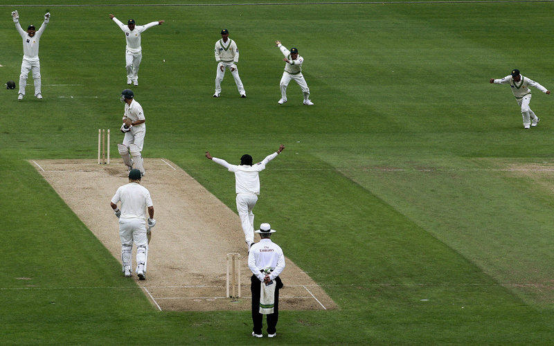 Asif's chip fell short of mid-off but Kaneria, having set off for a single, scrambled back to the crease, fell over and as the umpire called for a third umpire decision, the batsmen ran once more and again Kaneria gambolled into his crease but was out for his previous error.