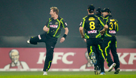 Australia's Brett Lee (left) celebrates taking the wicket of India's Virender Sehwag during their T20 match in Sydney on February 1. (FILE)