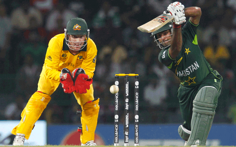Pakistan's Asad Shafiq (R) plays a shot watched by Australia's wicketkeeper Brad Haddin during their ICC Cricket World Cup group A match in Colombo. (REUTERS)
