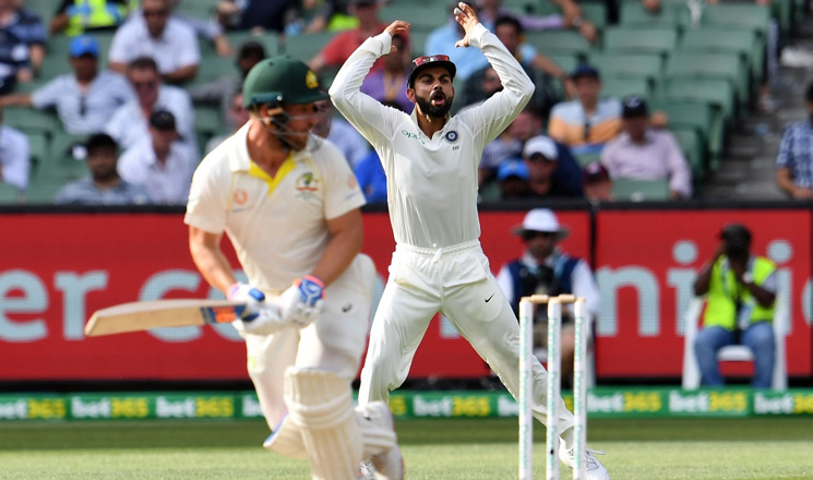 Usman Khawaja was the next to go after a lively 33, trapped lbw by Mohammed Shami. He chose to review the decision with the ball-tracking technology showing it clearly hitting the off stump.