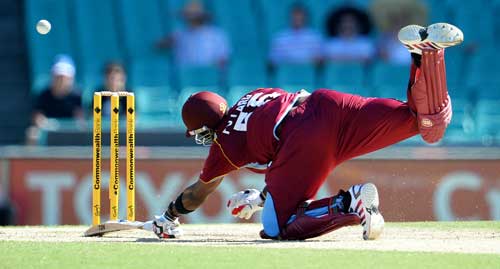 Tino Best is run out as West Indies end their innings at 220 in 49.4 overs.