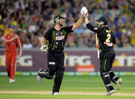 Australia's Cameron White (left) and George Bailey celebrate victory over England during the second T20 international cricket match in Melbourne on January 31, 2014. (AFP)