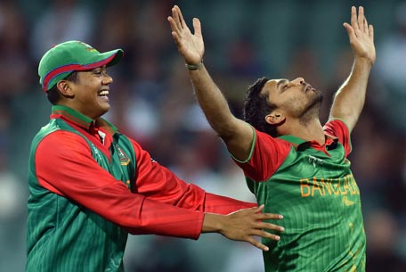 Bangladesh paceman Mashrafe Mortaza (R) celebrates his wicket of England's batsman Joe Root (not pictured) next to teammate Taskin Ahmed during the 2015 Cricket World Cup Pool A match between Bangladesh and England at the Adelaide Oval on March 9, 2015. AFP