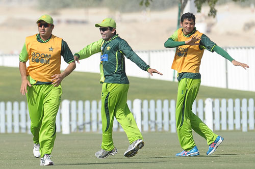 Pakistan's cricketers Saeed Ajmal (left), Adnan Akmal (centre) and Junaid Khan warm up during a practice session at the ICC Global Cricket Academy at Dubai Sports City on February 1, 2012 (AFP)