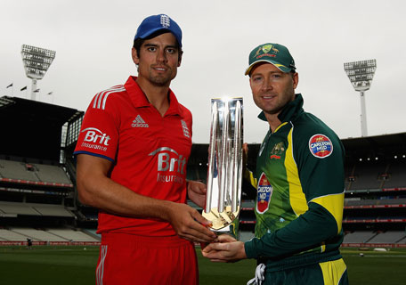 English captain Alastair Cook and Australian captain Michael Clarke pose with the ODI trophy during the One Day International media session at Melbourne Cricket Ground on January 11, 2014 in Melbourne, Australia. (GETTY)