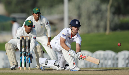 Alastair Cook of England on his way to a century during the tour match against a Pakistan Cricket Board XI at ICC Global Academy on Wednesday in Dubai. (GETTY)