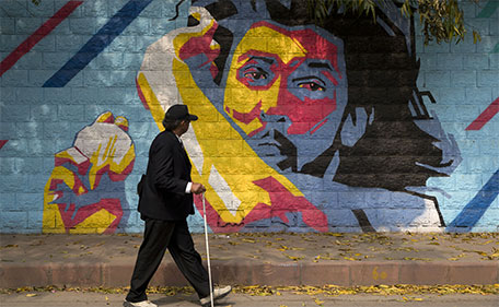An Indian blind man walks past graffiti of an Indian cricketer on the wall of the one of the stadium where ICC world Twenty20 tournament will be played, in New Delhi, India, Monday, March 7, 2016. (AP)