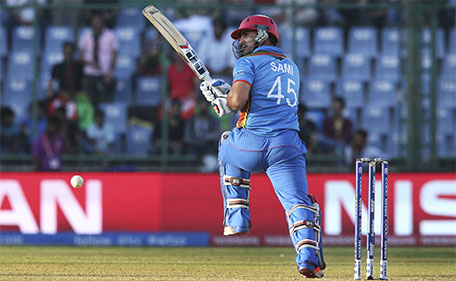 Afghanistan's Samiullah Shenwari plays a shot against England during their ICC Twenty20 2016 Cricket World Cup match at the Feroz Shah Kotla cricket stadium in New Delhi, India, Wednesday, March 23, 2016. (AP)