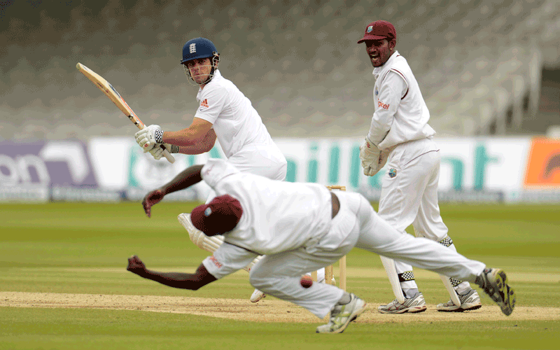 England's Alastair Cook hits the ball past West Indies' Darren Sammy as Denesh Ramdin (R) looks on during the first cricket test match at Lord's cricket ground in London. (REUTERS)