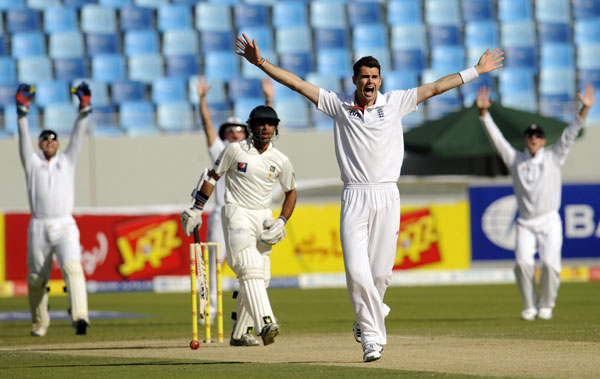 James Anderson ended the day on a high note for his team when he bowled Abdul Rehman (four) in the last over to leave Pakistan at 288-7 at the close, a lead of 96 over England's first innings total of 192.
