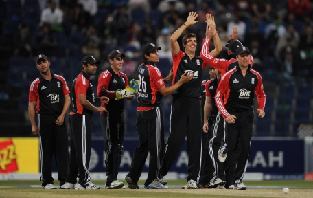 Steven Finn of England celebrates with teammates after dismissing Asad Shafiq of Pakistan during the first one-day international at Sheikh Zayed Stadium on Monday in Abu Dhabi. (GETTY)