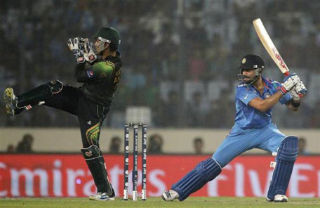 India's Virat Kohli (right) plays a ball as Pakistan's wicketkeeper Kamran Akmal tries to catch during their ICC Twenty20 World Cup cricket match at the Sher-E-Bangla National Cricket Stadium in Dhaka March 21, 2014. (REUTERS)