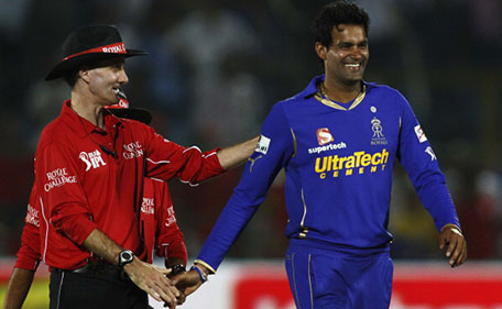 Match umpire Billy Bowden congratulates Rajasthan Royals bowler Ajit Chandila on his hat-trick during the IPL 5 T20 match played between Pune Warriors and Rajasthan Royals on May 13, 2012 in Jaipur, India. (Hindustan Times via Getty Images)