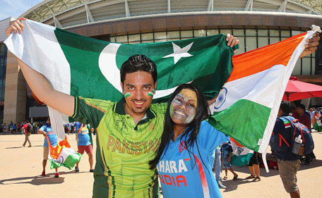 Pakistan and India supporters pose with their flags outside of the ground during the 2015 ICC Cricket World Cup match between India and Pakistan at the Adelaide Oval on February 15, 2015 in Adelaide, Australia. (Getty Images)