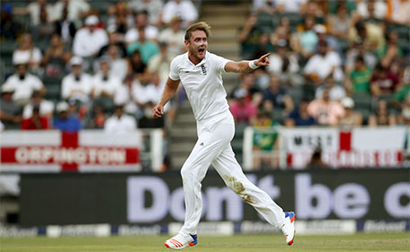 England's Stuart Broad gestures as he celebrates the dismissal of South Africa's captain AB de Villiers during the third cricket test match in Johannesburg, South Africa, January 16, 2016. (Reuters)