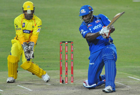 Pollard hits out at Bravo smashing him back past the bowler for a boundary. MI 106-5 in 16 overs.