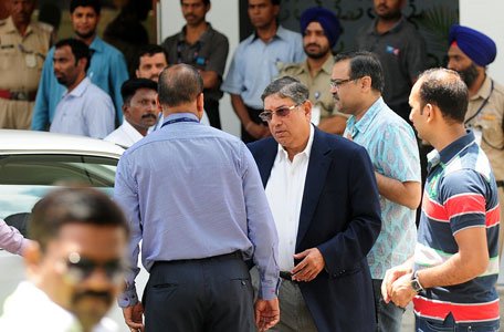 India's cricket chief Narainswamy Srinivasan, center, walks towards his car after arriving at the airport in Mumbai, India, Saturday, May 25, 2013. Srinivasan has dismissed calls for his resignation after his son-in-law and Chennai Super Kings official Gurunath Meiyappan was arrested by police for his alleged role in spot-fixing during the Indian Premier League. (AP)