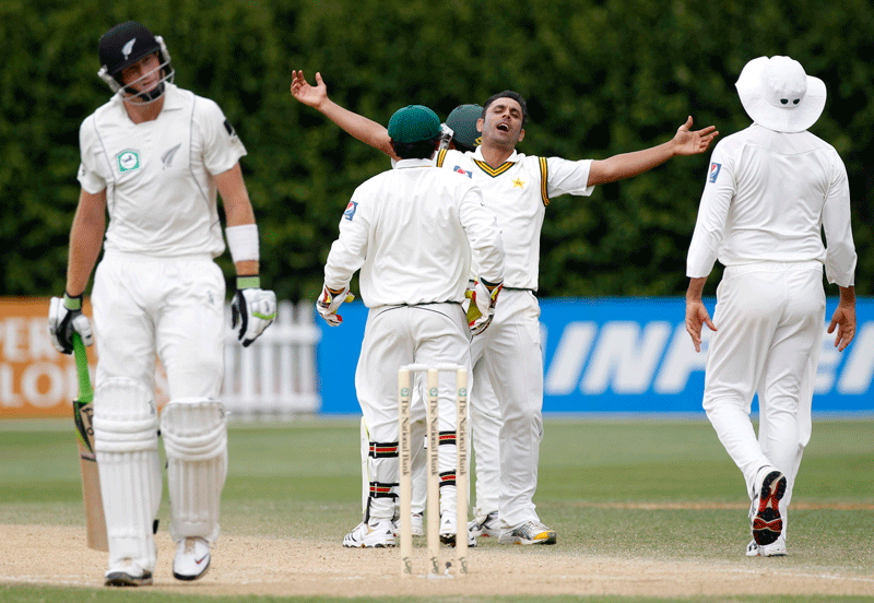 Pakistan’s Abdur Rehman celebrates the dismissal of New Zealand’s Martin Guptill (during the second innings on day four of their second Test in Wellington on Tuesday. (REUTERS)