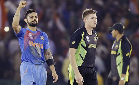 India's Virat Kohli (left) celebrates as he walks with Australia's James Faulkner after winning their ICC World Twenty20 2016 cricket match by six wickets in Mohali, India, Sunday, March 27, 2016. (AP)