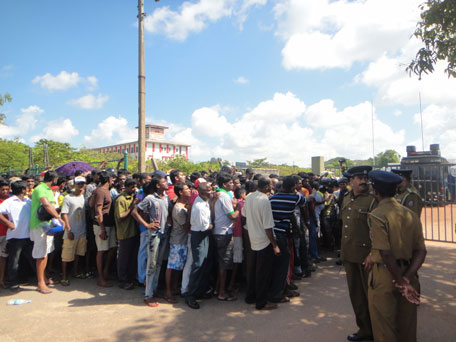 Cricket fans jostling in the queue to buys tickets for the World Twenty20 semifinal between Sri Lanka and Pakistan at a ticket booth in Colombo on Thursday morning. (ALLAAM OUSMAN)
