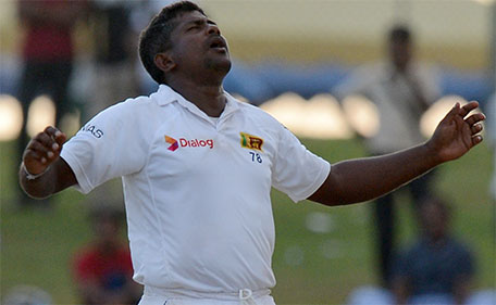 Sri Lankan spinner Rangana Herath celebrates the dismissal of West Indies cricketer Kraig Brathwaite during the third day of the opening Test match between Sri Lanka and the West Indies at the Galle International Cricket Stadium in Galle on October 16, 2015. (AFP)