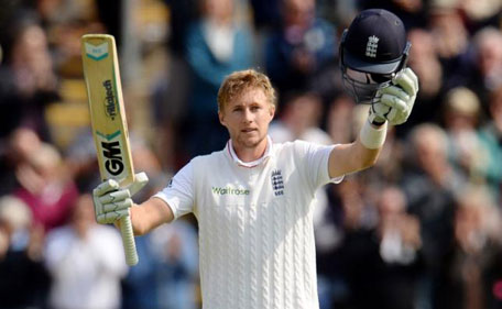 England's Joe Root celebrates reaching his century on day one of the 1st Ashes Test England v Australia at SWALEC Stadium, Cardiff, Wales on 8/7/15. (Reuters)