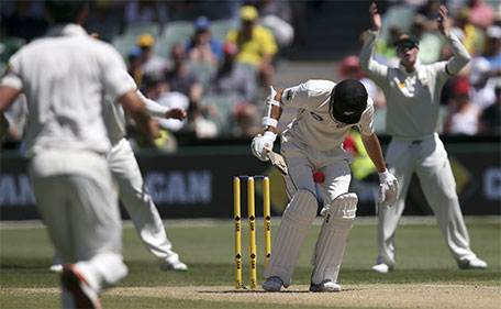 New Zealand's Mitchell Santner (centre) has the ball lodged between his legs while playing Australia during their cricket Test in Adelaide, Australia, Sunday, Nov. 29, 2015. (AP)