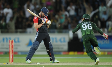 Craig Kieswetter of England is bowled by Mohammad Hafeez of Pakistan during the first Twenty20 international at Dubai International Stadium on Thursday in Dubai. (GETTY)