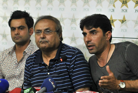 Pakistan ODI cricket captain Misbah-ul Haq (right) sits with chief selector Iqbal Qasim (centre) and Twenty20 skipper Mohammad Hafeez as he speaks during a news conference in Lahore on July 3, 2013. (AFP)