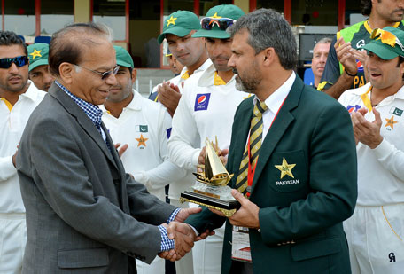 Pakistan cricket team manager Moin Khan (right) gives a present to veteran journalist Qamar Ahmed during the opening day of the third Test between Pakistan and Sri Lanka at the Sharjah Cricket Stadium, in Sharjah, UAE. (AFP)