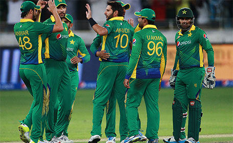 Pakistan bower Shahid Afridi celebrates the wicket of England batsman Alex Hales during the Pakistan and England T20 International match at the Dubai International Stadium in Dubai, United Arab Emirates, Friday, Nov. 27, 2015. (AP)