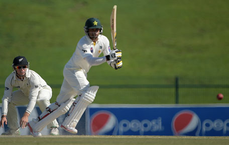 Pakistani batsman Mohammad Hafeez (right) plays a shot as New Zealand's Tom Latham looks on during the fourth day of the first Test match between Pakistan and New Zealand at the Zayed International Cricket Stadium in Abu Dhabi on November 12, 2014. (AFP)