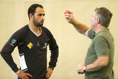 Former Australia spinner Stuart MacGill (right) chats to Victorian player Fawad Ahmed during a meeting at the Sydney Cricket Ground Indoor Nets on March 28, 2013 in Sydney, Australia. (GETTY)