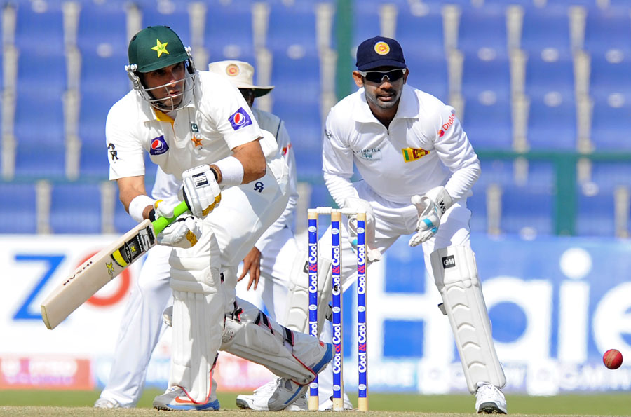 Misbah smacks spinner Senanayake through extra cover for his fifth boundary as Pakistan take lunch at 121-3 in 46 overs in reply to Sri Lanka's first innings total of 204.
