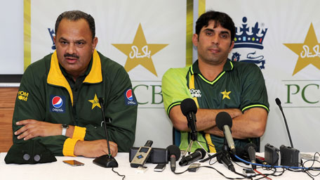 Pakistan manager Naveed Akram Cheema (left) and captain Misbah ul Haq attend a press conference at the ICC Global Academy on Tuesday in Dubai. (GETTY)