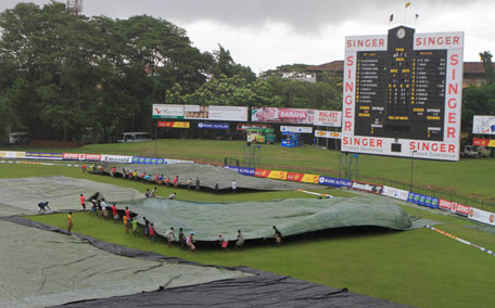 The visitors declared their first innings on an imposing 551-6 and claimed an early wicket as Sri Lanka went to lunch on 70-1. No play was possible after lunch due to rain.