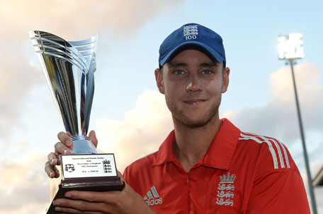 English captain Stuart Broad poses with the trophy after his team won the third and last one-day international between West Indies and England, at the Sir Vivian Richard Stadium in St John's, March 5, 2014. (AFP)