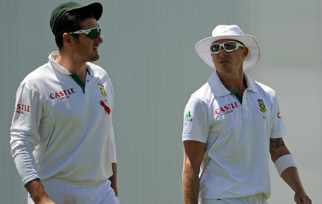 South African bowler Dale Steyn (R) speaks with his captain Graeme Smith (L) on day two of the third cricket Test between South Africa and Australia at the WACA ground in Perth on December 1, 2012. (AFP)