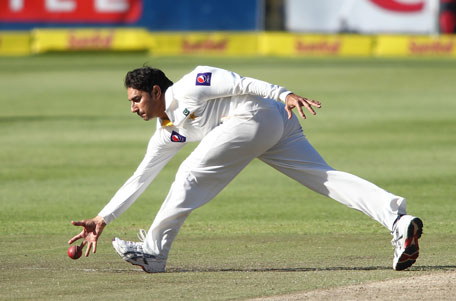 Umar Gul bowls a maiden to Dean Elgar to begin proceedings on the third morning at Sahara Park Newlands in Cape Town on Saturday.