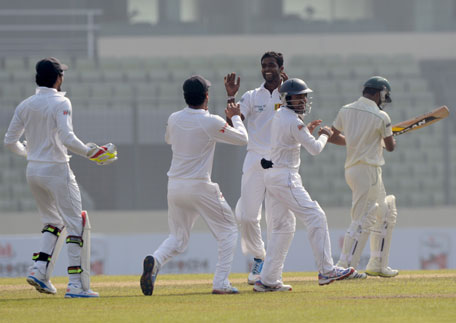 Sri Lankan bowler Shaminda Eranga (centre) celebrates with his teammate Kaushal Silva (second right) after the dismissal of the Bangladeshi batsman Shamsur Rahman during the first day of the first Test between Bangladesh and Sri Lanka at the Sher-e-Bangla National Cricket Stadium in Dhaka on January 27, 2014. (AFP)